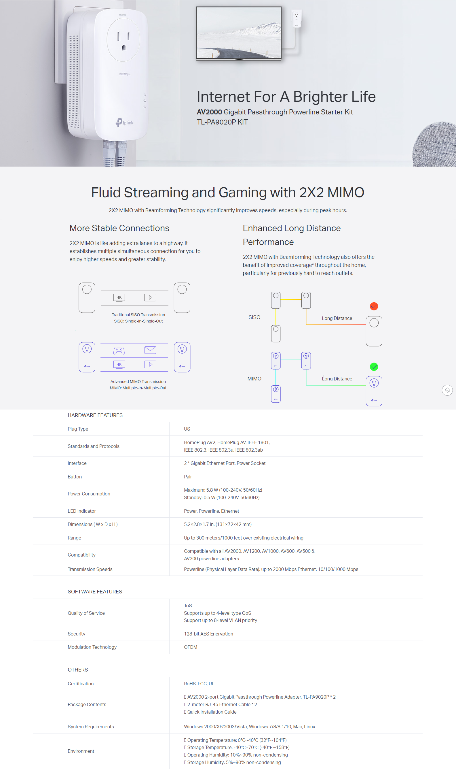 - 2X2 MIMO with Beamforming establishes multiple simultaneous connections for you to enjoy higher powerline speeds and greater stability