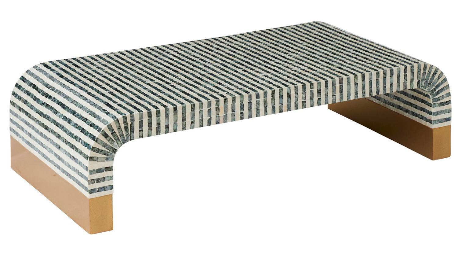 Bold lines meet artisan texture in the Kaman Inlay Table. Featuring a low, streamlined form and a captivating black‑and‑ivory inlay pattern, this piece delivers subtle drama while maintaining versatility. The beautifully curved edges soften its modern profile, and the gold-accent base adds a refined highlight. Use it as a coffee table, display platform, or statement art piece.