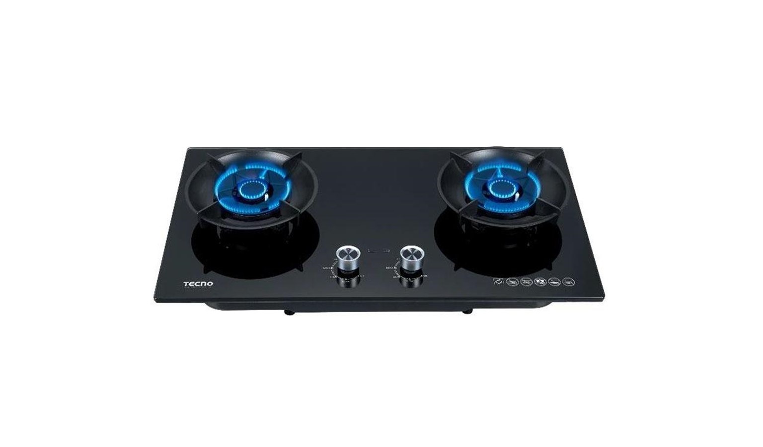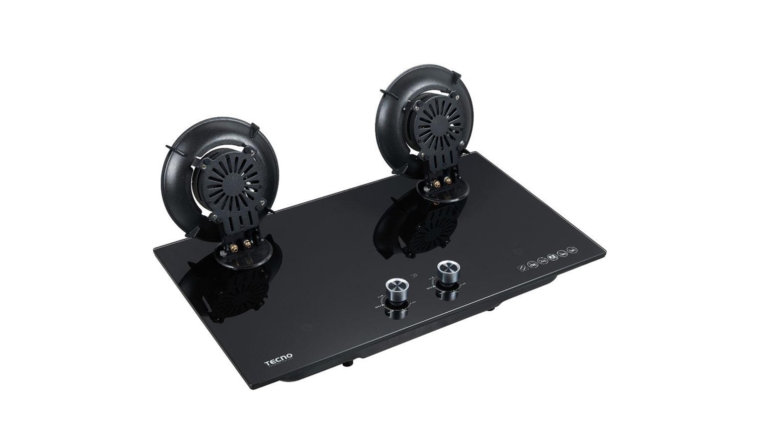 The Tecno T-762FLIP-T is a 76cm tempered glass hob featuring 2 large 4.0KW wok burners with a flip-up design for easy cleaning and a safety lock. It offers precision control, a timer function (1 to 180 minutes), and zero-second delayed instant ignition. Suitable for table-top usage with LPG, it includes wind-blocking cast iron supports, cool-touch knobs, and a battery-operated ignition.