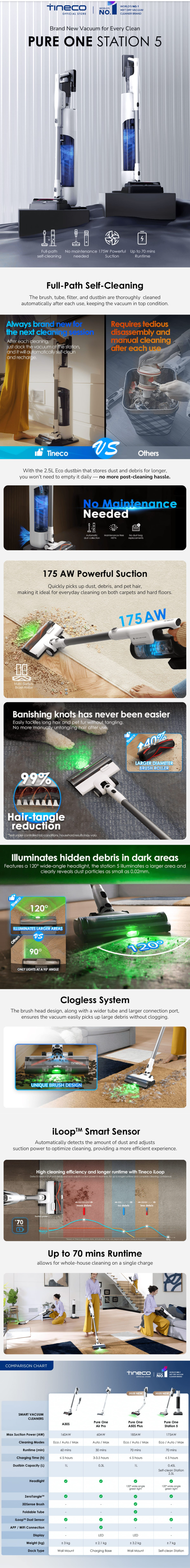 The Tineco Pure One Station 5 Cordless Smart Vacuum – White features a freestanding docking station that auto‑empties the stick’s bin into a spacious 2.5 L base and self‑cleans its filter and brush for maintenance-free use. With up to 175 W suction, a ZeroTangle roller, and iLoop smart sensors that adjust power based on dirt, it delivers efficient, pet‑hair‑friendly cleaning.