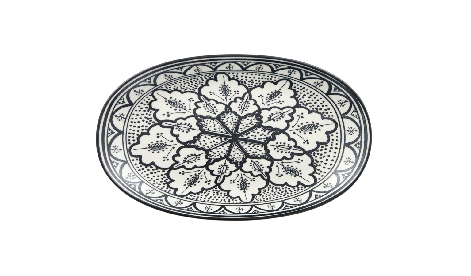 Oval ceramic dish with intricate black-and-white detailing. Ideal for appetisers, sides, or decorative use.