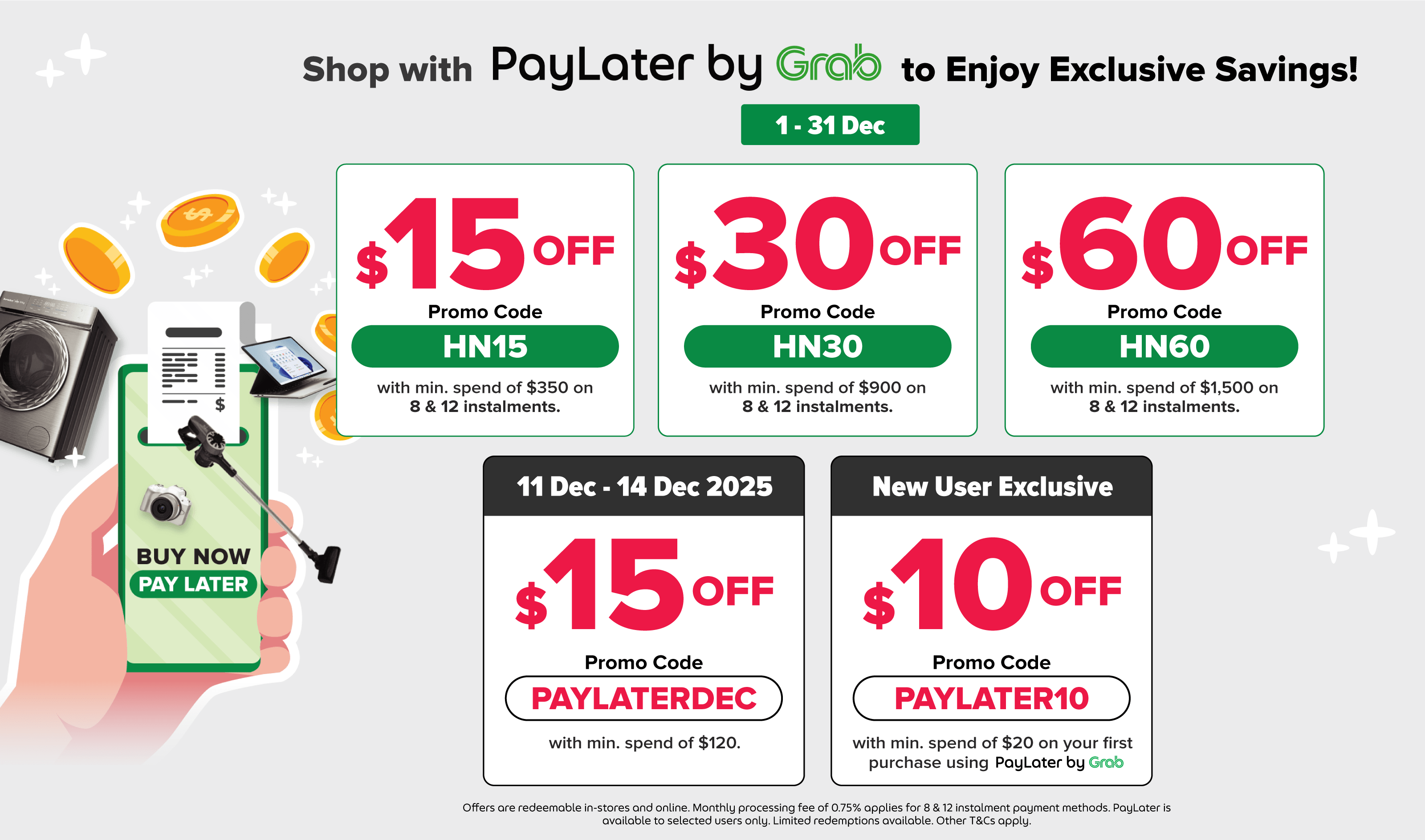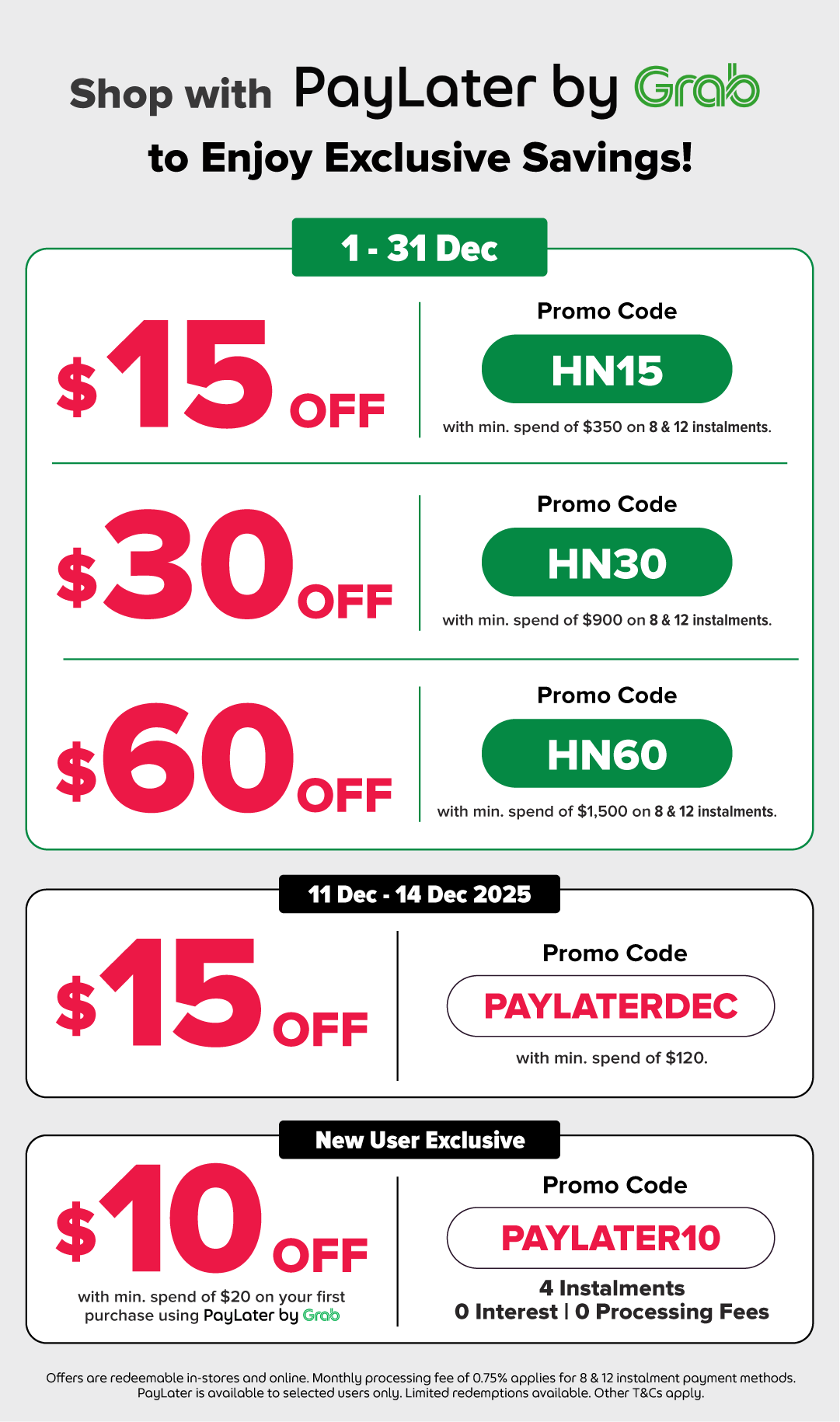 • Promo is applicable with a minimum spend of $150, $350, $900 and $1,500 respectively with PayLater Instalments.