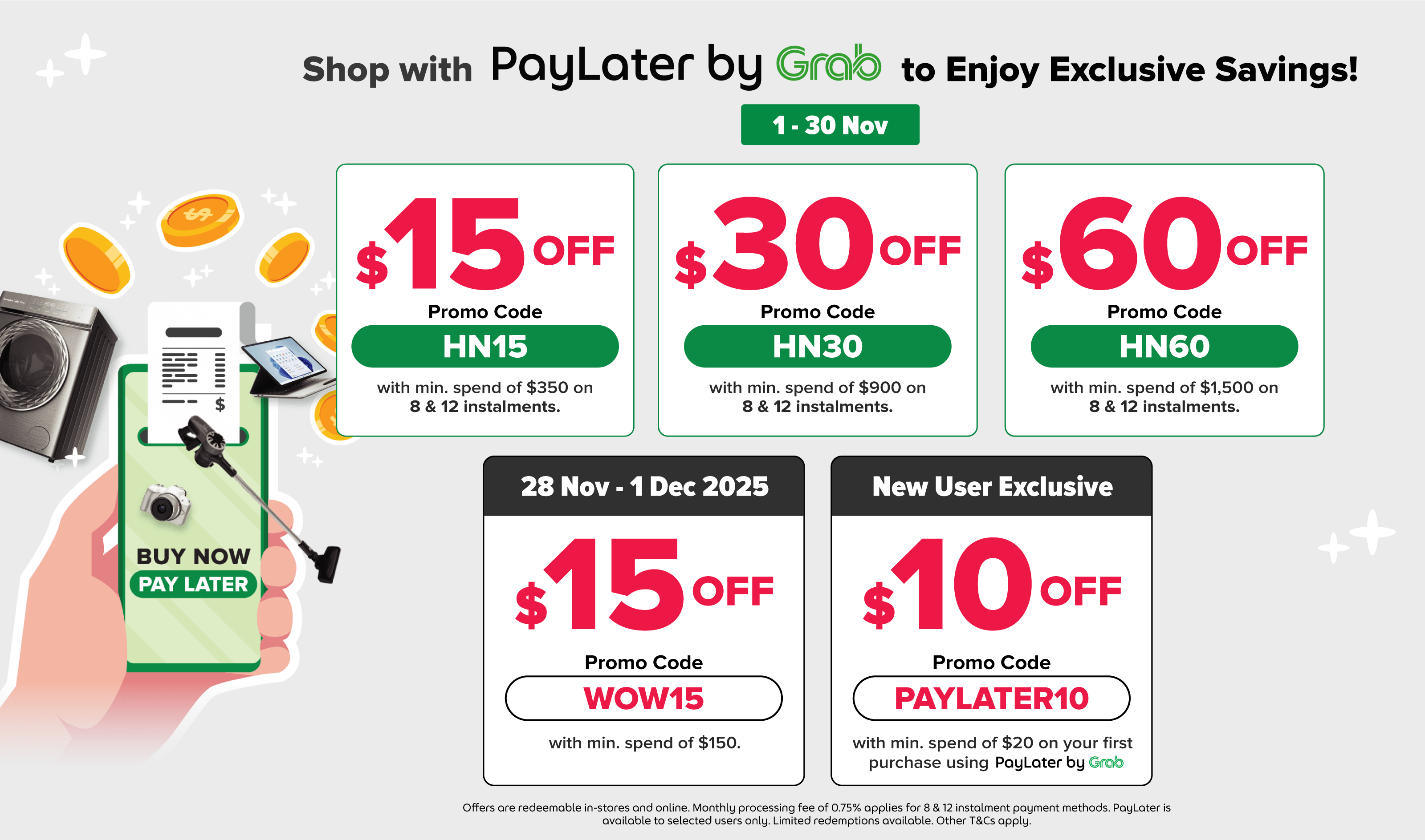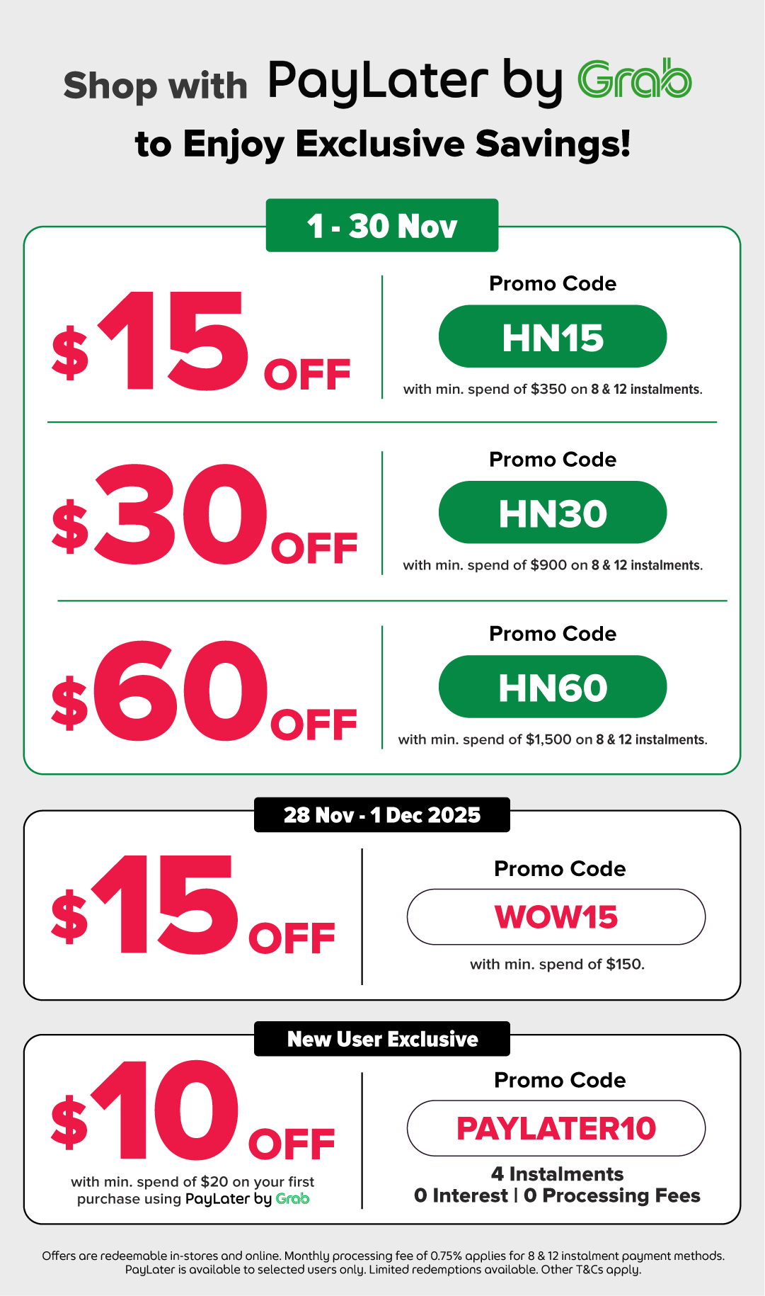 • Promo is valid for purchases made with PayLater Instalment on participating merchants only. It is not valid if payment is made with the GrabPay Card or third-party e-wallets.