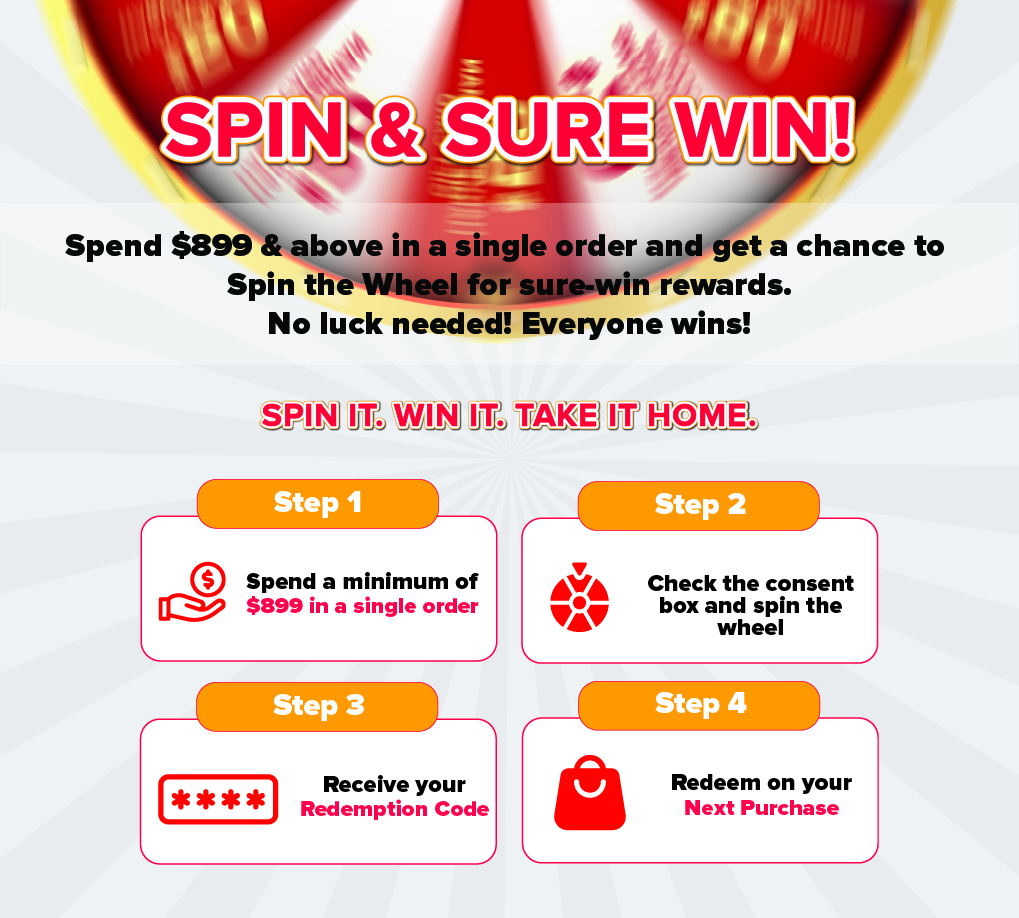 • The e-Voucher can be utilized for the subsequent online purchase on www.harveynorman.com.sg (with no minimum spend) from 16 April - 31 May 2026, for selected items marked with "Available for Spin & Sure Win e-Voucher redemptions" only.