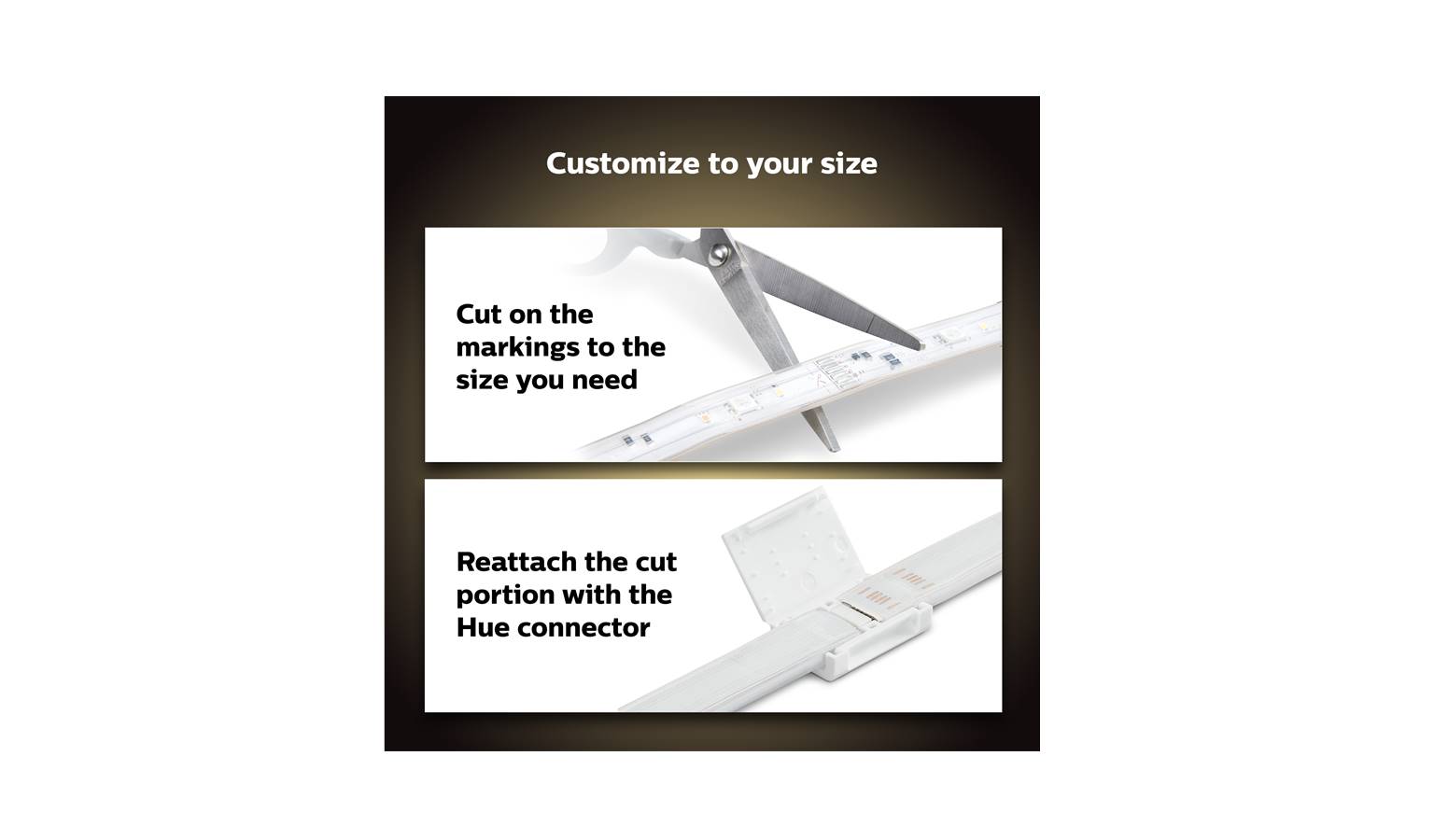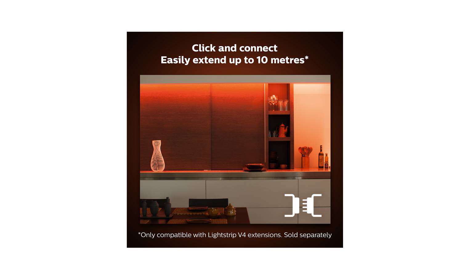 To any solid surface using the adhesive tape and get the flexibility you need. The leftover piece will not go to waste: use included connector clip to attach cut off strip to another lightstrip base unit!Extend up to 10 meters!Philips Hue Lightstrips gives you FULL colour consistency from first to last extension.