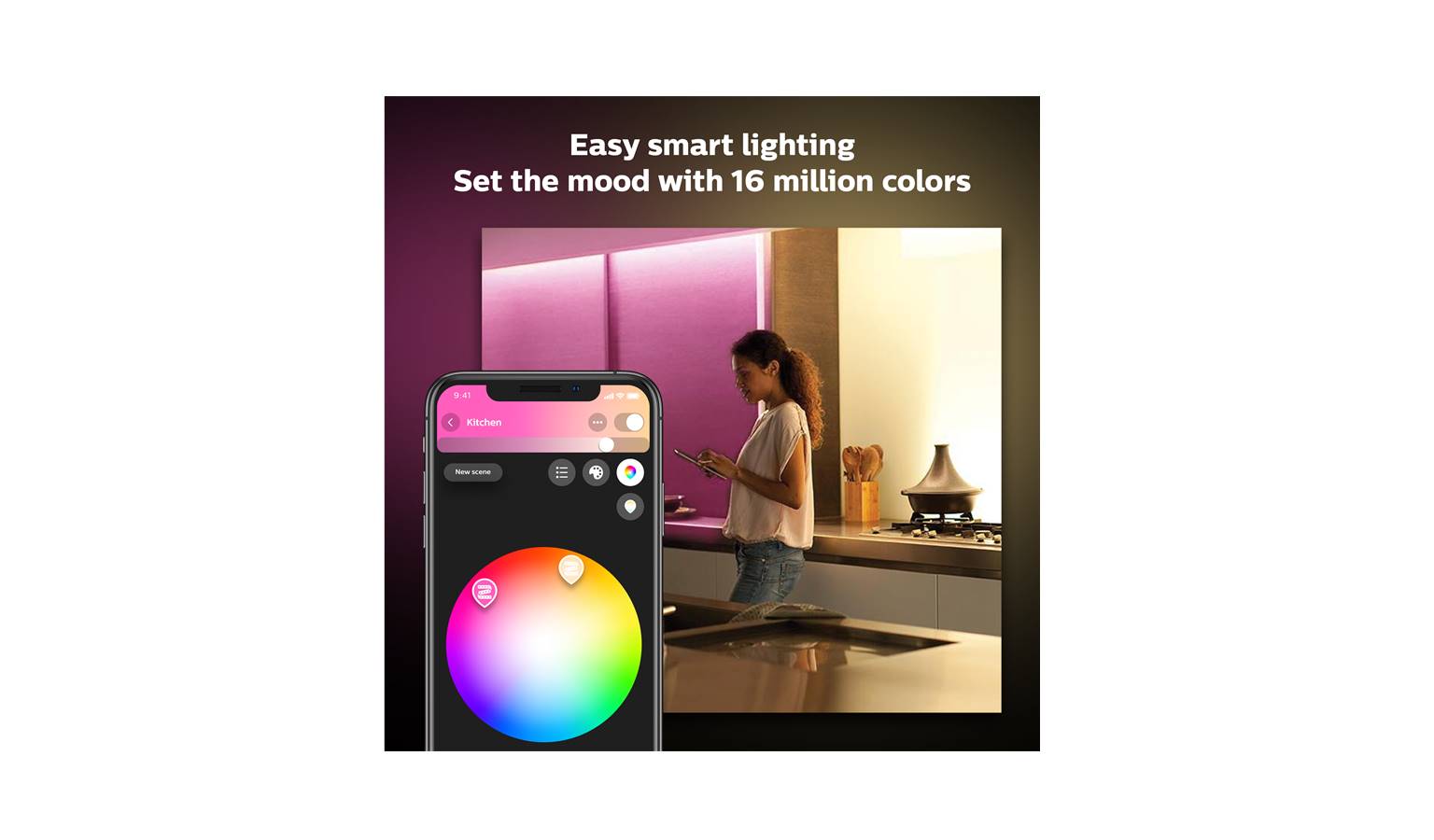 With a simple and easy setup, start adding colour under kitchen cabinets, kitchen islands, bed frames, behind your TV, hallways, stairs, closet, ceiling cove, and the list goes on and on – anything is possible, unleash your imagination.Create personalized scenes with 16 million colours or set the mood with 15,000 shade of white for your daily needs.