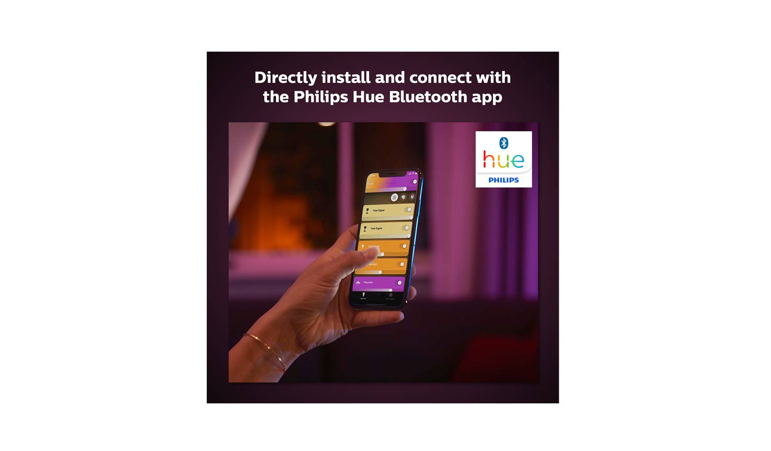 Simply want to set the mood? Start with Bluetooth app control. Add up to 10 Hue Bluetooth/Zigbee smart bulbs with the (free) Hue Bluetooth app. Control them all with just the touch of a button on your mobile device or your favourite voice assistant. Add the Hue Bridge for whole-home smart lighting (up to 50 light points) and bonus features.