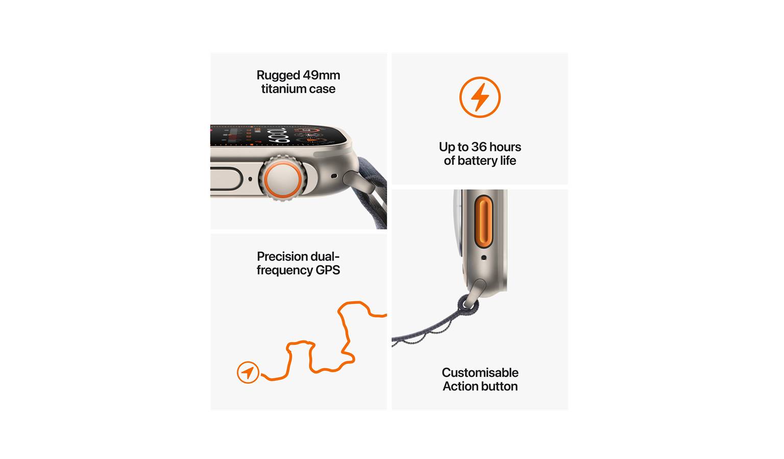 - EXTREMELY RUGGED, INCREDIBLY CAPABLE — 49mm corrosion-resistant titanium case. Large Digital Crown and customisable Action button for instant control over a variety of functions.100m water resistance.5